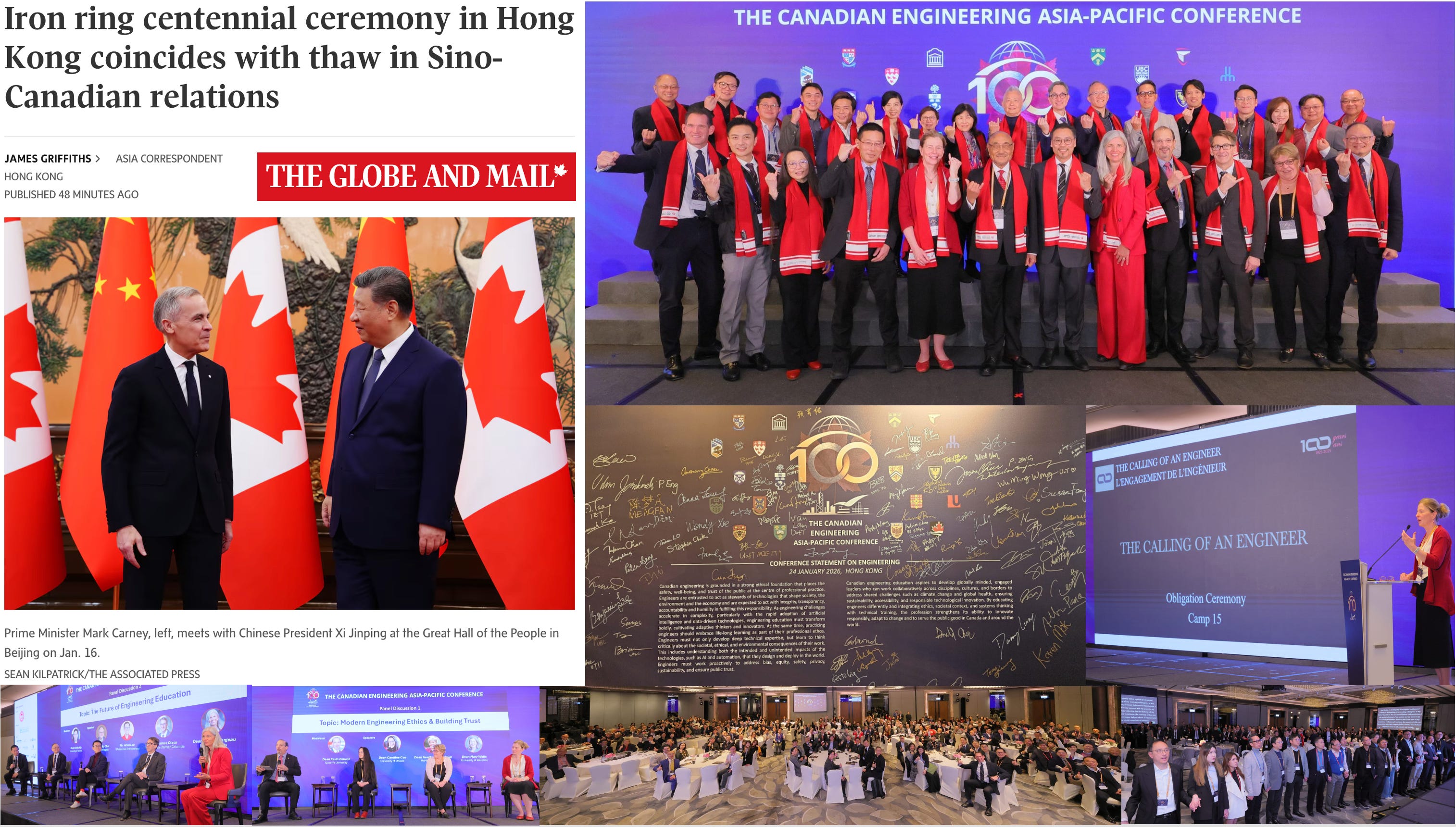 The Globe and Mail (Jan 25, 2026): Iron ring centennial ceremony in Hong Kong coincides with thaw in Sino-Canadian relations
