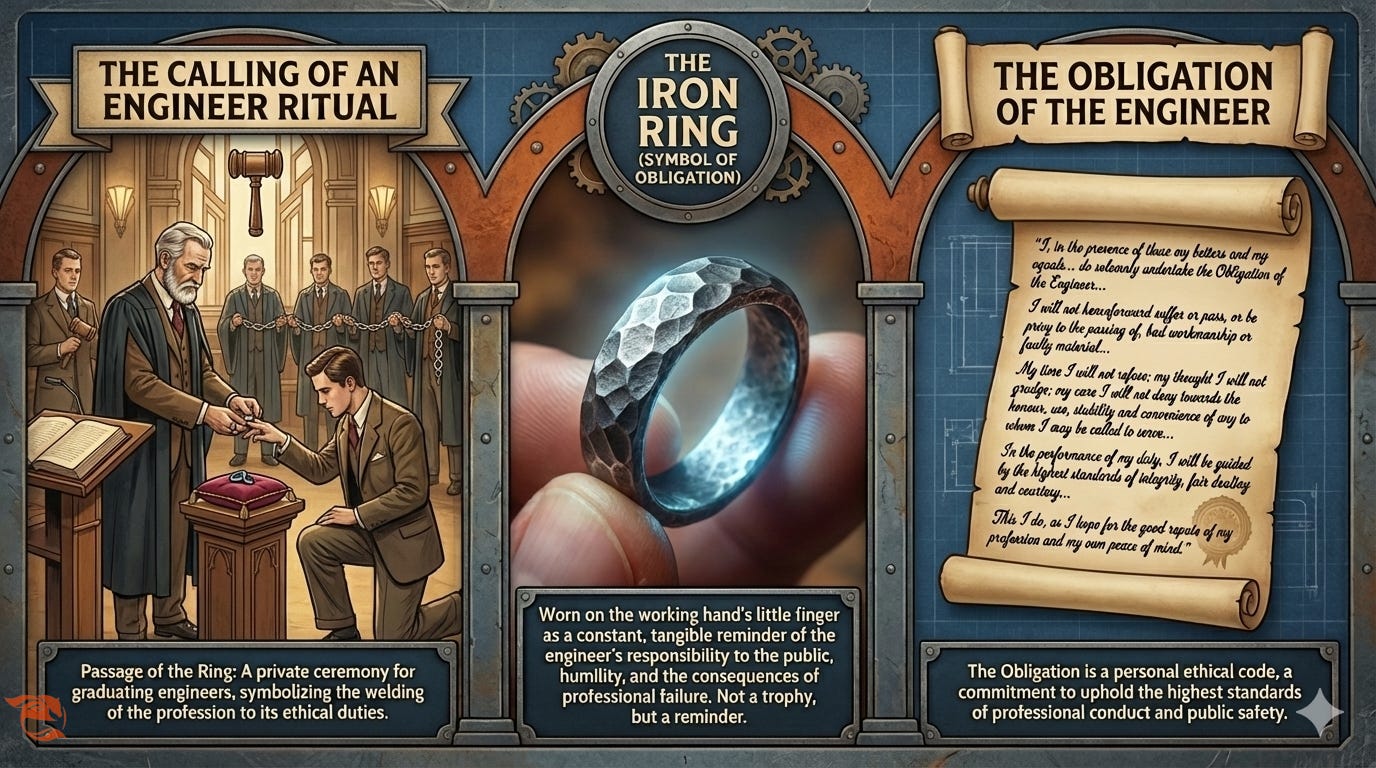 The Iron Ring ceremony in the final year of study is one of the most secretive and theatrical experiences in Canadian engineering education. No photographs. No public livestream. No family in the audience. You are ushered into a private ritual, sworn to secrecy, and invited to join a chain of engineers stretching back a century. The legend goes that the first rings were hammered from the collapsed steel of the Quebec Bridge, whose catastrophic failure in 1907 killed many workers and shook public confidence in engineering. Rudyard Kipling, the author of The Jungle Book, was asked to write the ceremonial “Ritual of the Calling of an Engineer,” a text so guarded that it was long kept out of print and only modernized by the Seven Wardens in 2025 [1, 2]12.